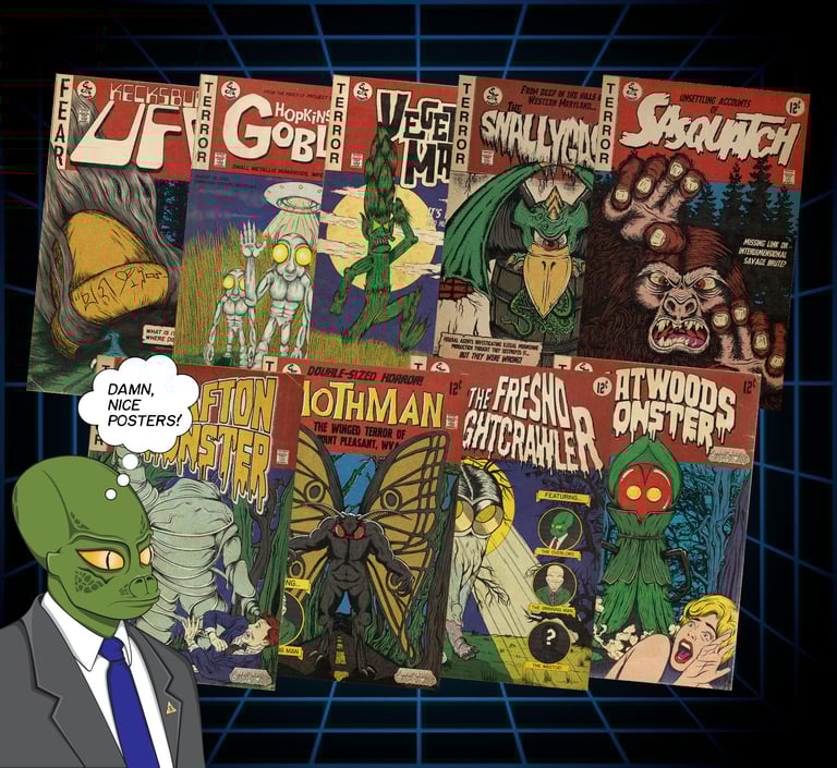 Nine different cryptid, monster, alien, otherworldly beings to choose from including; Vegetable Man, The Snallygaster, Sasquatch aka Bigfoot, The Grafton Monsters, Mothman, The Fresno Nightcrawler, The Flatwoods Monster, Kecksburg UFO, and Hopkinsville Goblins (coming soon!)
